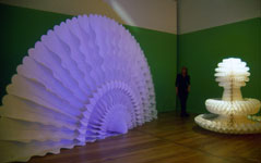 sculptural synthesis of florid and floral forms, colour lit white surfaces