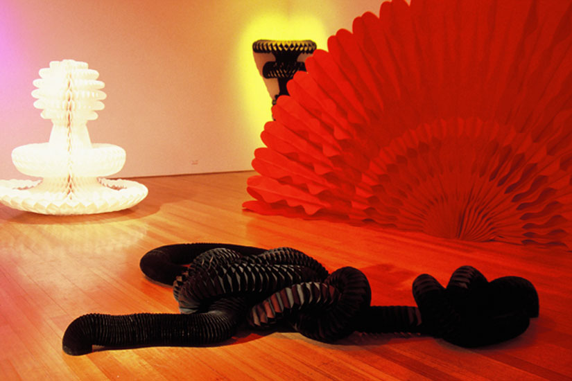 In subsequent years, several honey-comb paper sculptures were commissioned for the following: the stage production ‘Carmen Miranda Revue Pavillon’, Director - Holgar Freidrich, Haus der Berliner Festspiele, Berlin (2001); the concourse area of The Esplanade Arts Complex, Singapore (2003); a promotional event, Hermes Australia, Centennial Park, Sydney (2006); and the Moet & Chandon Spring Carnival Tent, Melbourne Cup (2006).