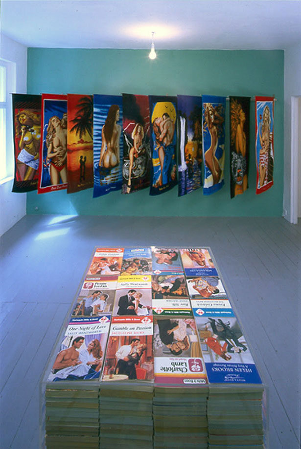 manipulated photographs, a shelf of romantic novels and a rack of ’girlie’ beach