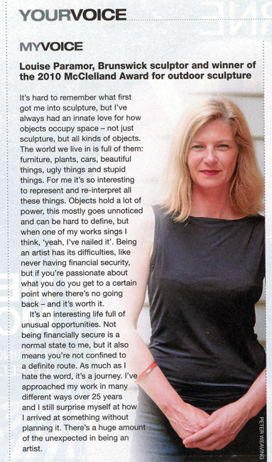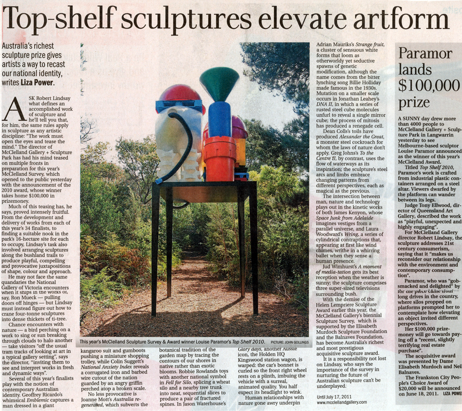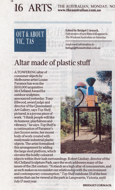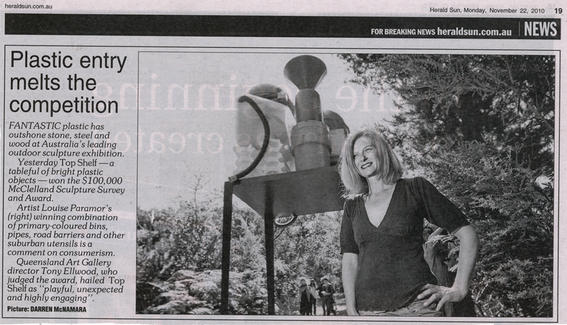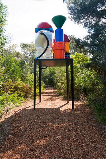 In my sculptural work of recent years, I have been preoccupied with industrial plastic objects, and have presented them in a variety of assembled structures, each with the linking title, 'Jam Session'. Works in this series include: Industrial Jam Session, 2007 (Helen Lempriere National Sculpture Award Exhibition, Werribee); Monumental Jam Session, 2008 (Helen Lempriere National Sculpture Award Exhibition, Werribee); Tritonic Jam Session, 2008 (Melbourne Prize for Urban Sculpture, Federation Square); and Heavy Metal Jam Session, 2009 (permanent public sculpture commission, COSTCO Wholesale, Docklands, Melbourne).